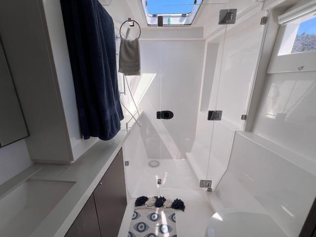 The Owners’ Suite occupies all of her starboard hull, while the port hull has two comfortable sleeping cabins, each with its own head and shower.